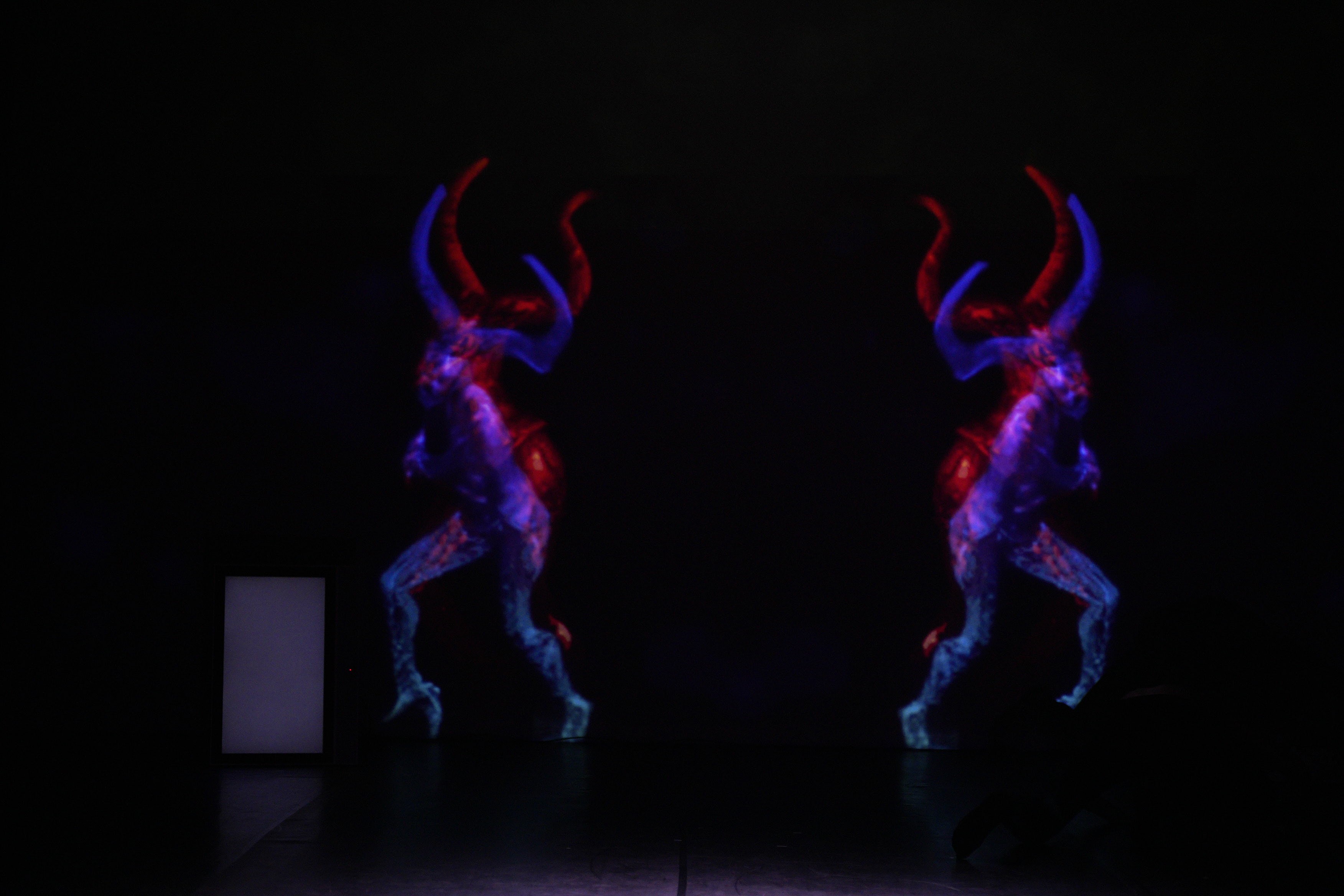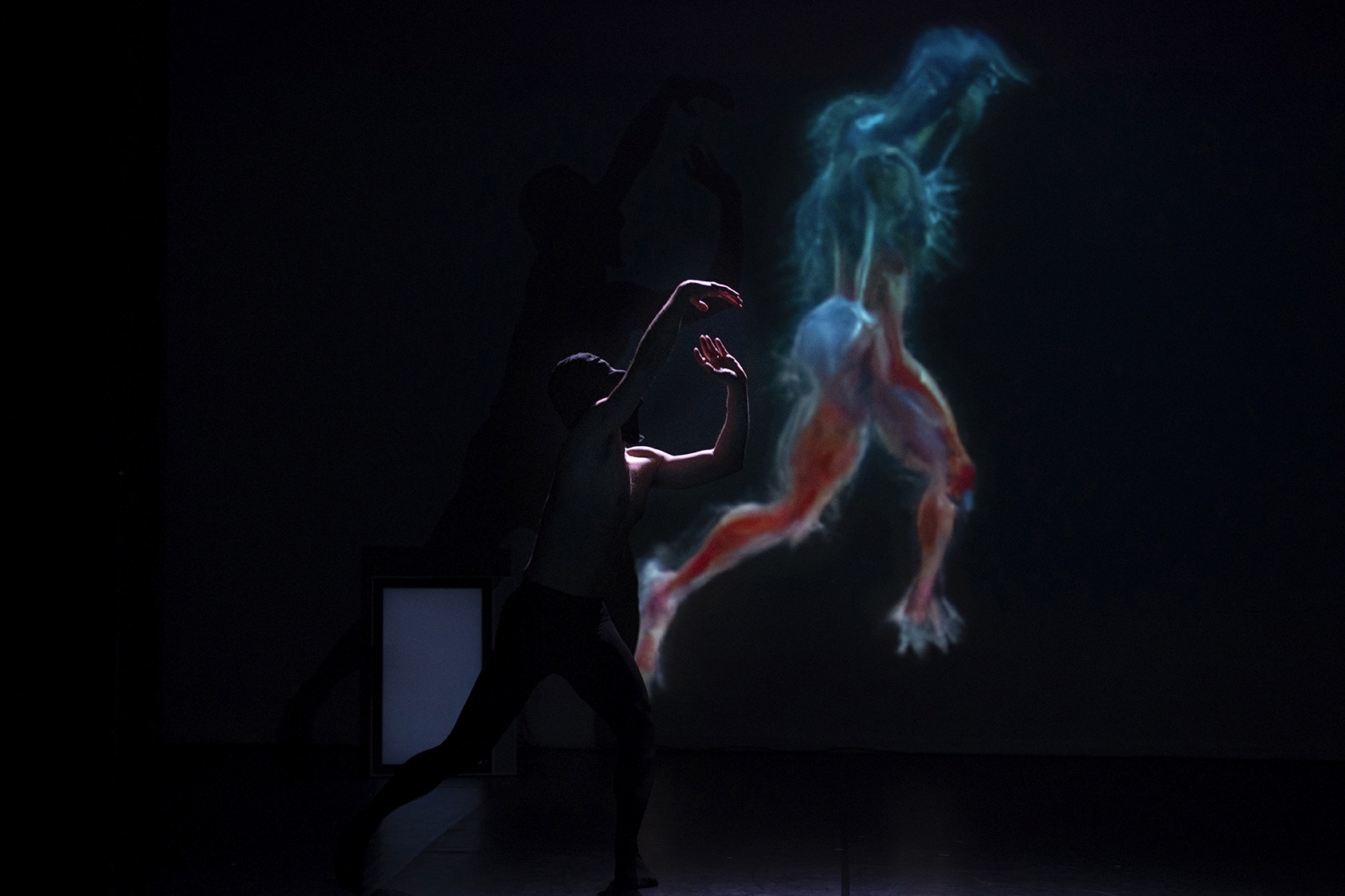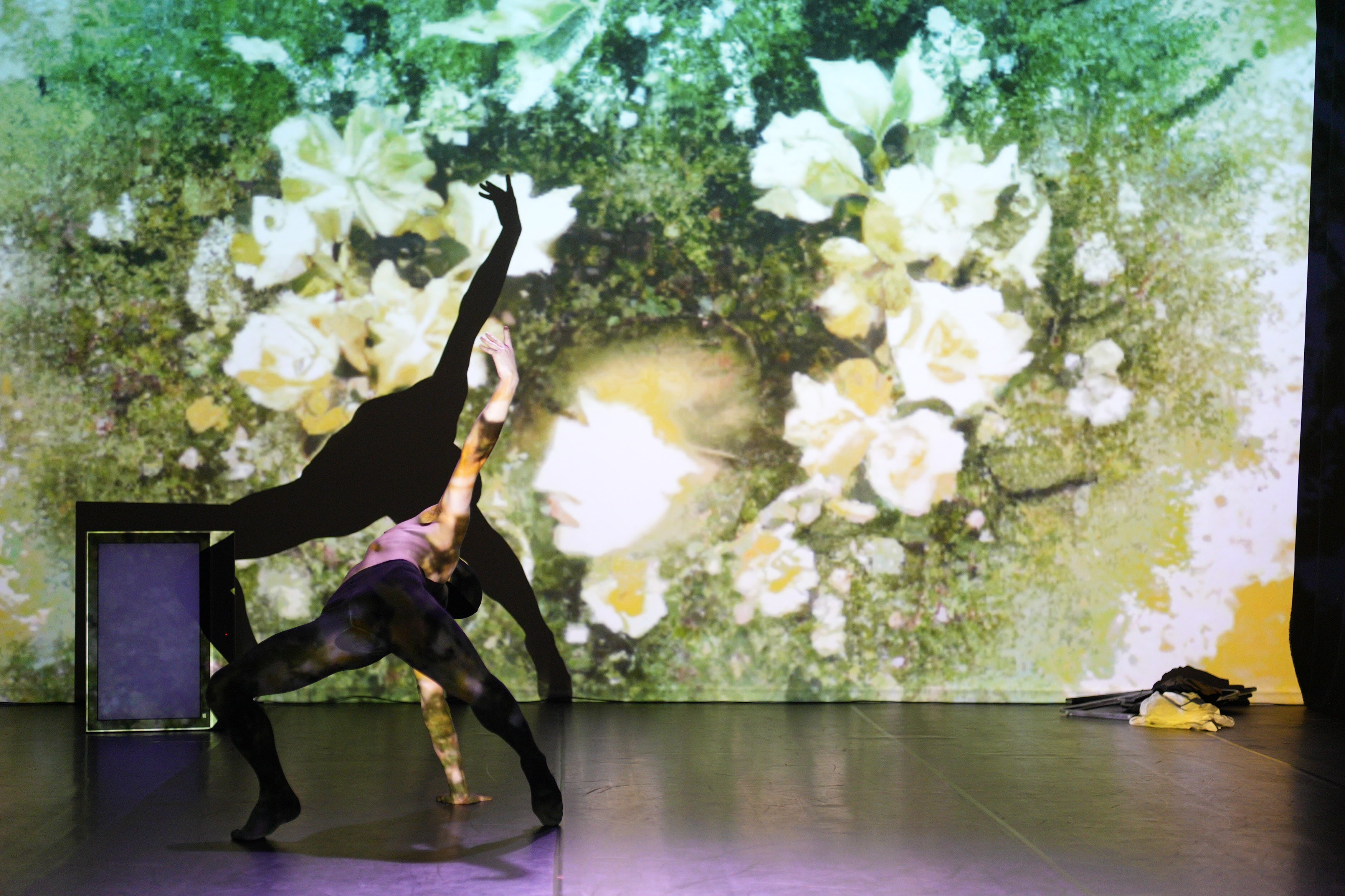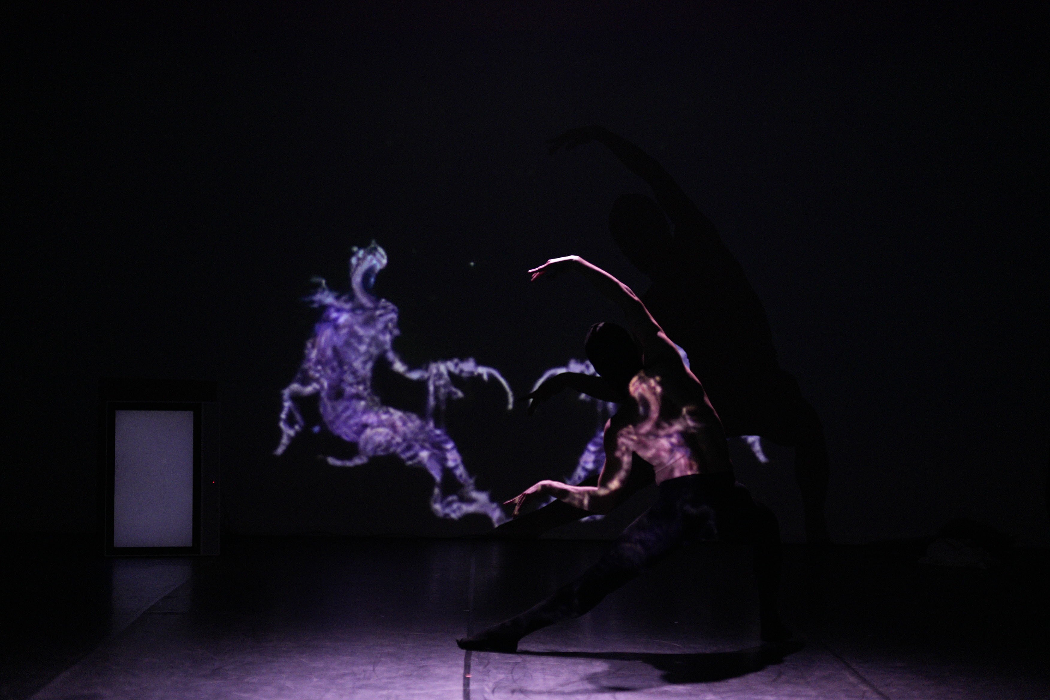 Unlike traditional screenings, the AI-generated texture is projected back onto the moving body with precise calibration. This creates a digital second skin that adheres to the performer. The show runs on a hybrid timeline: while the narrative cues are time-coded to the music, the visual generation remains live and reactive to the dancer’s unique expression.